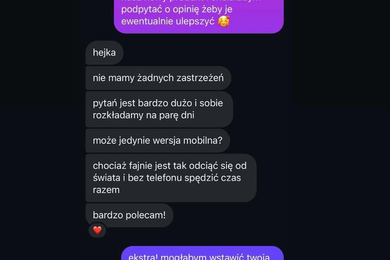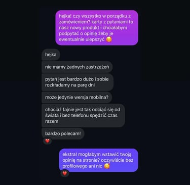 Odkryj na nowo bliskość i zaufanie dzięki naszym kartom dla par. Zawierają starannie dobrane pytania, które pomogą Wam lepiej się poznać, otworzyć na siebie i wzmocnić Waszą więź. Idealne na wieczór we dwoje – zadawajcie pytania, słuchajcie odpowiedzi i budujcie głębsze połączenie.